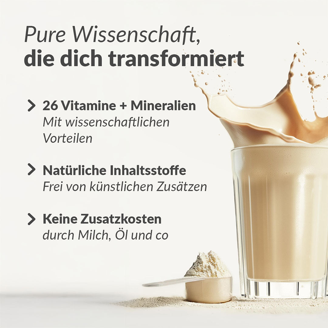 Sojaeiweißisolat 40,0 %, Hafervollkornmehl 36,7 %, mittelkettiges Triglyceridpulver (Kokos), Saflorölpulver (Safloröl 50 %, Maissirup-Feststoffe, modifizierte Stärke, Trennmittel (Siliciumdioxid), Stabilisator (Mono- und Diglyceride von Speisefettsäuren), Antioxidationsmittel (Natriumascorbat)), Trikaliumcitratmonohydrat, Tricalciumphosphat, Aroma, Magnesiumbisglycinat, Salz, Süßungsmittel (Steviolglykoside aus Stevia), Verdickungsmittel (Xanthan), Calcium-L-ascorbatdihydrat, Eisenbisglycinat, Zinkbisglycinat, D-alpha-Tocopherylacetat, Nicotinamid, Kupferbisglycinat, Manganbisglycinat, Calcium-D-pantothenat, Natrium-Riboflavin-5′-phosphat, Pyridoxinhydrochlorid, Retinylpalmitat, Thiaminmononitrat, L-5-Methyltetrahydrofolsäure; Calciumsalz, Kaliumiodid, Chrompicolinat, L-Selenomethionin, Menachinon-7, Natriummolybdat, D-Biotin, Cholecalciferol, Hydroxocobalamin