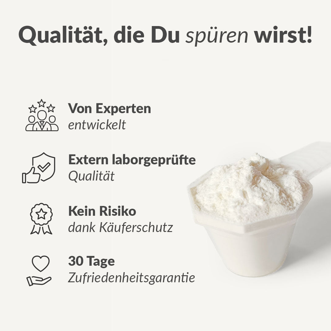 Wir sind bis zur letzten Muskelfaser von der Wissenschaft und der Qualität unserer Produkte überzeugt – und darum erhältst Du bei uns eine risikofreie 30 Tage Geld-zurück-Garantie.